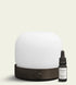 Ultraschall-Diffuser-Lampe mit Glaskuppel, Metallsockel und dimmbarem Licht. Ätherische Ölmischung im Fläschchen mit Randtropfer. Der feine Nebel sorgt für eine gleichmäßige und schnelle Raumbeduftung.