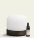 Ultraschall-Diffuser-Lampe mit Glaskuppel, Metallsockel und dimmbarem Licht. Ätherische Ölmischung im Fläschchen mit Randtropfer. Der feine Nebel sorgt für eine gleichmäßige und schnelle Raumbeduftung.